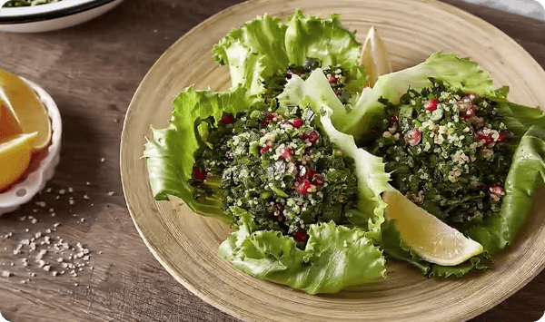 להרכבה: מערבבים את הבורגול עם הירקות הקצוצים והרימונים ומתבלים במלח, שמן ומיץ לימון ומסדרים על הצלחת לצד עלי חסה טריים.